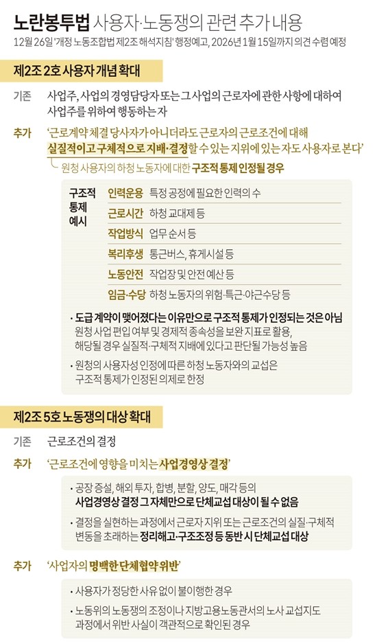 26일 고용노동부가 행정 예고한 노란봉투법 가이드라인은 원청 사용자가 하청 노동자의 근로조건을 '구조적 통제'하는지 여부를 사용자 개념의 핵심으로 규정했다.