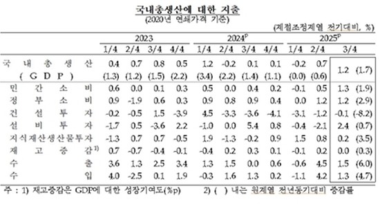 이동원 한은 경제통계2국장은 "소비심리 개선, 소비쿠폰과 전기차 보조금 등 정부 정책, 스마트폰·전기차 신제품 출시 효과, 전공의 복귀 등에 따른 종합병원 의료 소비 증가 등에 힘입어 민간 소비가 1% 이상 성장했다"고 설명했다.