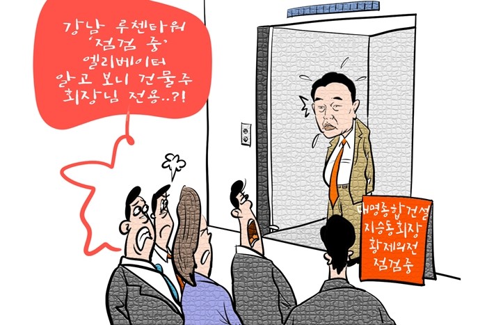 | ▲ 데일리-경제만평=강남 루첸타워, '점검중' 엘리베이터…건물주 대명종합건설 회장 단독 사용 논란? @데일리매거진 |