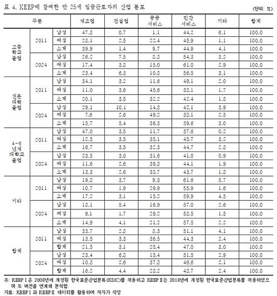 4~6년제 대학교 졸업 남성 집단의 경우 2011년에는 제조업(47.0%) 부문 취업 비율이 가장 높았으나 2024년에는 23.5%로 절반가량 감소했다.