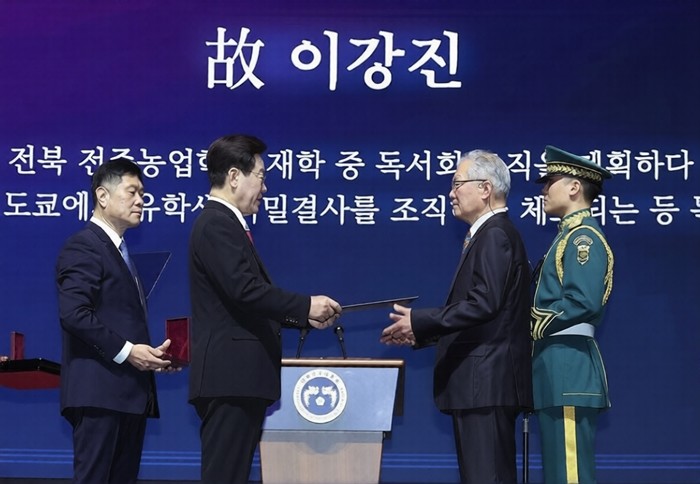 | ▲ 사진=이재명 대통령, 1일 서울 강남구 코엑스에서 열린 제107주년 3·1절 기념식에서 고 이강진 유공자의 외손자 황인성 씨에게 건국훈장 애족장 수여 [제공/연합뉴스] |