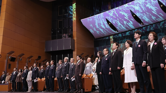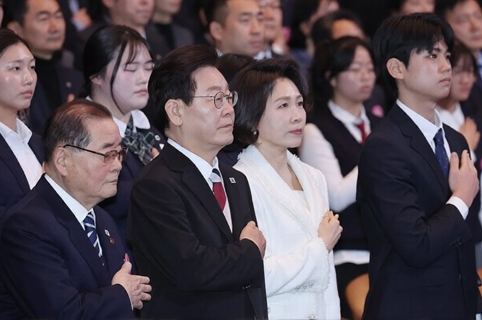 | ▲ 사진=이재명 대통령과 김혜경 여사, 이종찬 광복회장 등이 1일 서울 강남구 코엑스에서 열린 제107주년 3·1절 기념식에서 애국가 제창 [제공/연합뉴스] |