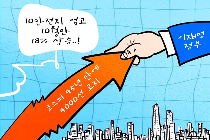 | ▲ 데일리-경제만평=코스피, 45년 만에 4,000선 돌파…삼성전자도 10만2000원에 마감 @데일리매거진 |