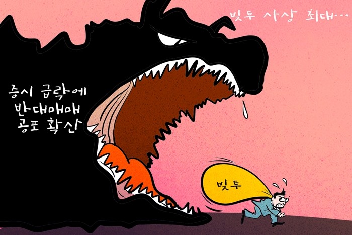 | ▲ 데일리-경제만평= 증시 급락에 반대매매 공포 확산…'빚투, 사상 최대치 기록' @데일리매거진 |