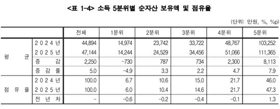순자산 5분위 가구의 평균 자산은 17억4천590만원으로, 1분위 가구(3천890만원)의 44.9배에 달했다.