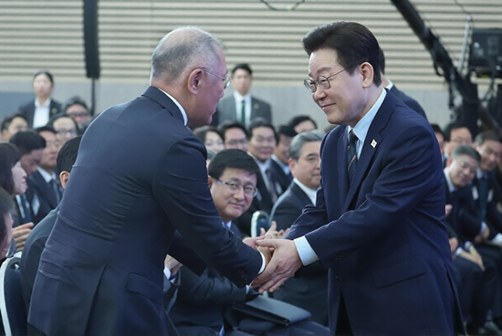 | ▲ 사진=이재명 대통령이 27일 전북 군산새만금컨벤션센터에서 열린 새만금 로봇·수소·AI 시티 투자협약식에서 축사를 마친 뒤 정의선 현대차그룹 회장과 악수 [제공/연합뉴스] |