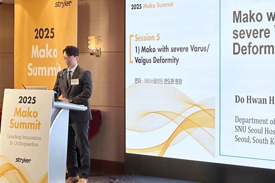 | ▲ 사진=SNU서울병원 무릎전담팀 한도환 원장은 'Mako TKA 사례 기반 패널 토론' 세션에서 중증 내반·외반 변형 무릎 환자의 MAKO 로봇 인공관절 수술 경험을 발표하며, 3D 기반 정밀 수술 계획과 인대 균형 조절의 장점을 강조 [제공/SNU서울병원] |