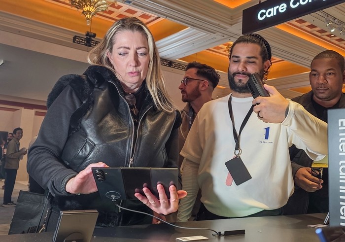 ▲ 사진=관람객이 미국 라스베이거스에서 열리는 세계 최대 전자 전시회 'CES 2026'에 마련된 윈호텔 삼성전자 단독 전시관에서 삼성전자 '갤럭시 Z 트라이폴드'를 구경 [제공/삼성전자]