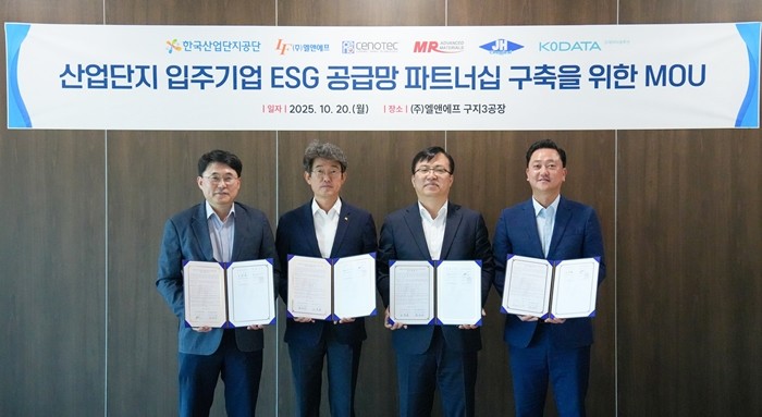 엘앤에프는 20일 대구국가산업단지에 위치한 구지3공장에서 한국산업단지공단을 비롯해 협력사 쎄노텍, ESG 전문기관 코데이터솔루션과 함께 ‘산업단지 입주기업 ESG 공급망 파트너십 구축을 위한 업무협약(MOU)’을 체결했다고 21일 밝혔다.