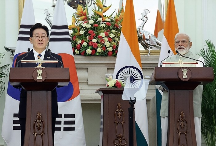 | ▲ 사진= 이재명 대통령과 나렌드라 모디 인도 총리가 20일(현지시간) 뉴델리 영빈관에서 공동언론발표 [제공/연합뉴스] |