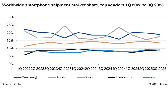 | ▲ 상위 공급 업체 분기 별 전 세계 스마트폰 출하량 시장 점유율(2023년 1분기 - 2025년 3분기 기준) [제공/옴디아] |