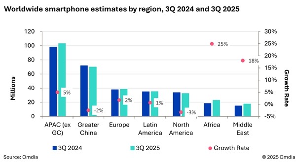 | ▲ 전 세계 지역별 스마트폰 출하 추정치(2024년 3분기 vs 2025년 3분기) [제공/옴디아] |