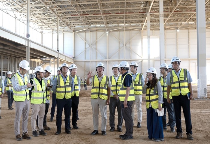 | ▲ 사진=정의선 회장(가운데), 호세 무뇨스 사장(앞줄 왼쪽에서 세번째)이 박원균 HMMME 법인장(앞줄 오른쪽에서 세번째), 사우디 신공장 건설 진행 현황 점검 [제공/현대자동차그룹] |
