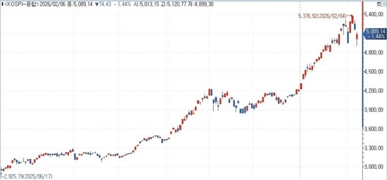 코스피가 전날보다 74.43포인트(1.44%) 내린 5,089.14로 마감했다