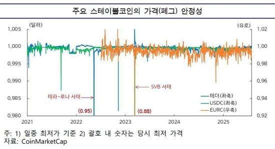 한은이 위험의 근거로 제시한 해외 사례나 분석을 보면, 스테이블코인은 본질적으로 법정통화와 '1대 1 가치 유지'를 약속하지만 2023년 초 USDC(써클)의 경우 실리콘밸리은행(SVB) 파산의 영향으로 한 때 0.88달러까지 떨어졌다.