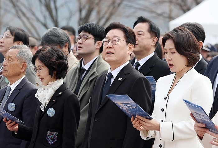 | ▲ 사진=이재명 대통령과 참석자들이 15일 경남 창원시 마산회원구 국립 3·15 민주 묘지에서 열린 제66주년 3·15의거 기념식에서 3·15의거 노래 제창 [제공/연합뉴스] |