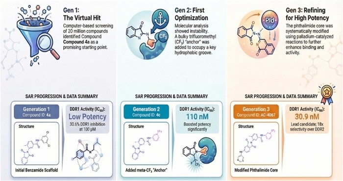 연구팀은 구조 기반 가상 스크리닝과 분자동역학 시뮬레이션 및 자유에너지 계산 등을 통해 DDR1의 결합 구조를 정밀하게 분석하고, 구조-활성 상관관계(SAR) 최적화를 거쳐 후보 물질을 도출했다.