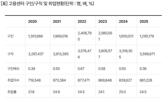 구인인원은 2020년 130만명대를 기록한 후 2021년 197만명, 2022년 240만명, 2023년 208만명으로 증가세를 보였으나, 2024년 165만명으로 떨어진 후 2025년 129만5천여명으로 크게 줄었다.
