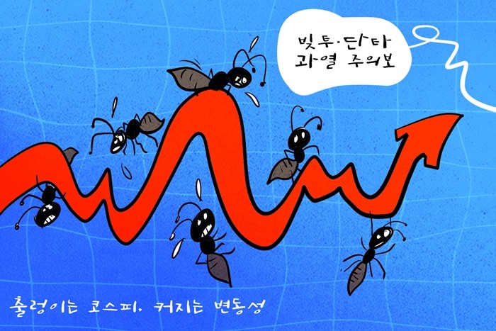 | ▲ 데일리-경제만평=중동 전쟁 여파로 지난달 코스피의 고·저 변동률 22.6% 기록 @데일리매거진 |