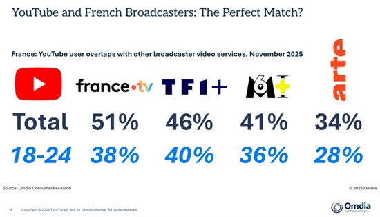 유튜브와 프랑스 TV(France TV), TF1+, M6+ 등 주요 프랑스 방송사 간에 상당한 시청자 중복이 존재하지만, 데이터에 따르면 유튜브 시청자의 상당 부분이 기존 방송을 시청하지 않는 것으로 나타나, 유튜브가 추가 시청자(incremental reach)를 확보하는 데 핵심적인 플랫폼이 되고 있다.
