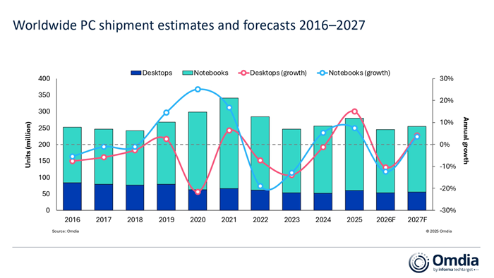 옴디아(Omdia)의 최신 전망에 따르면 2026년 전 세계 데스크톱, 노트북, 워크스테이션 출하량은 12% 감소한 2억4500만 대를 기록할 것으로 예상된다.