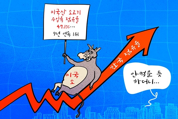 | ▲ 데일리-경제만평=미국산 '소고기·돼지고기'…한국 내 수입육 시장에서 점유율 47.1%로 1위 @데일리매거진 |