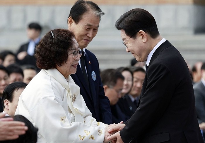 | ▲ 사진=이재명 대통령이 15일 경남 창원시 마산회원구 국립 3·15 민주 묘지에서 열린 제66주년 3·15의거 기념식에서 기념사를 마친 뒤 오무선 유족회장 위로 [제공/연합뉴스] |