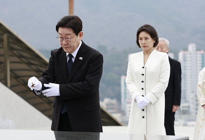 | ▲ 사진=이재명 대통령과 김혜경 여사가 15일 경남 창원시 마산회원구 국립 3·15 민주 묘지에서 분향 [제공/연합뉴스] |