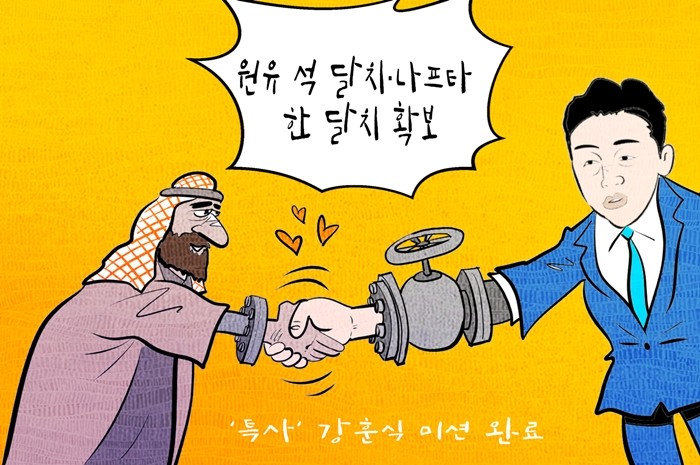| ▲ 데일리-경제만평=강훈식 비서실장, "올해 말까지 '원유 2억7천300만 배럴·나프타 210만톤' 도입 확정" @데일리매거진 |