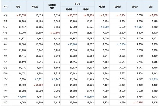전국에서 칼국수 가격이 가장 비싼 곳은 제주(1만375원)였으며, 비빔밥은 전북(1만1천900원)이 서울보다 비쌌다.