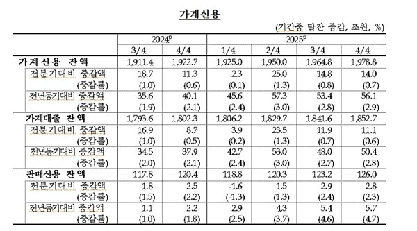 한국은행이 20일 발표한 '2025년 4분기 가계신용(잠정)' 통계에 따르면 지난해 12월 말 기준 가계신용 잔액은 1천978조8천억원으로 집계됐다.